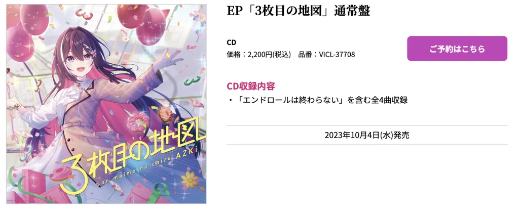 10月に届く予定のAZKiさんのメジャーデビューEP「3枚目の地図」を楽しみに今後も、開拓者の一員としてAZKiさんを応援していきたいと思います