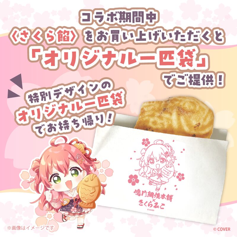 今回のコラボの目玉は、季節限定の「さくら餡」たい焼きです。この「さくら餡」を購入すると、さくらみこさんのイラストが描かれた「オリジナル1匹袋」に入れて提供されます。