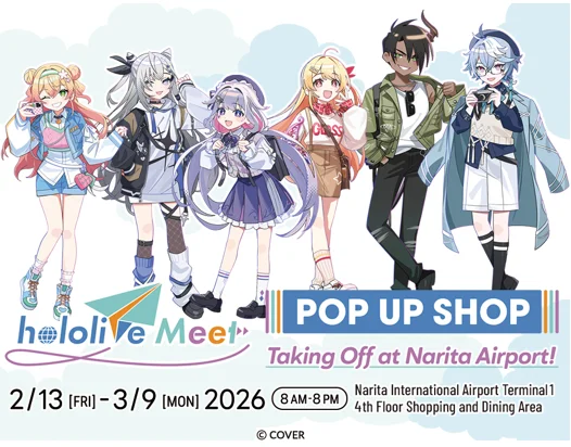 2026年2月13日(金)から3月9日(月)まで、成田国際空港 第1ターミナル中央ビル4階に「hololive Meet Pop up Shop: Taking Off at Narita Airport!」がオープンします。