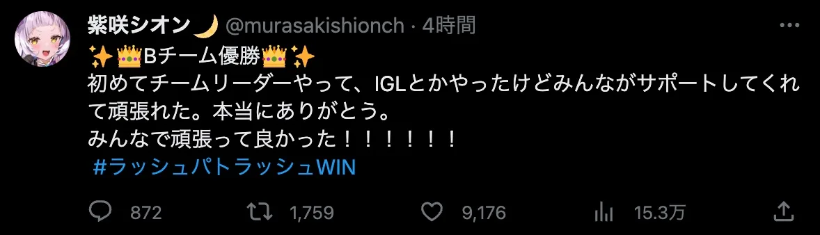 シオンちゃんACEかっこ良すぎやろ…#紫咲シオン #コレクシオン#ホロヴァロ #ラッシュパトラッシュWIN pic.twitter.com/R7pfGCD3CI