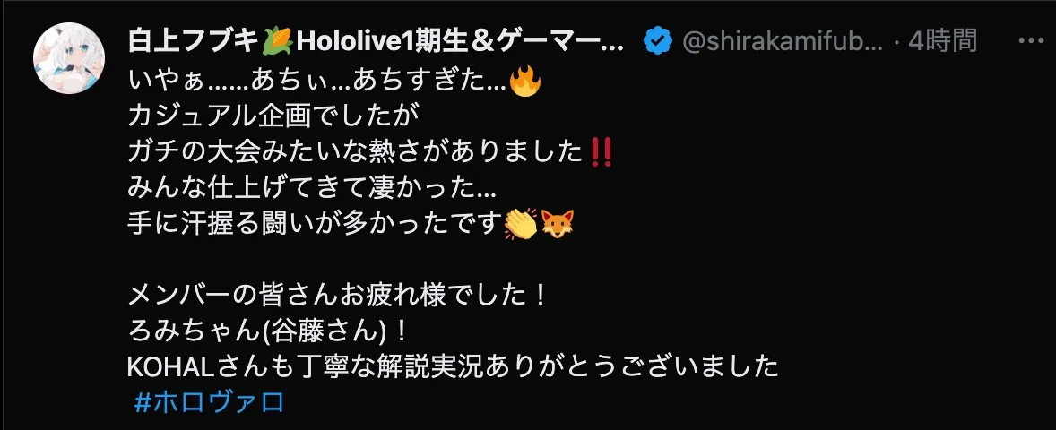 試合の内容もエンジョイ大会というのは一切感じさせないくらい、プロが使う戦法を駆使して有利を取ったりしてホロライブメンバーらの本気度が見えつつ、チーム内のボイスチャットは和気あいあいとしており楽しく試合をやっているのが感じられました。