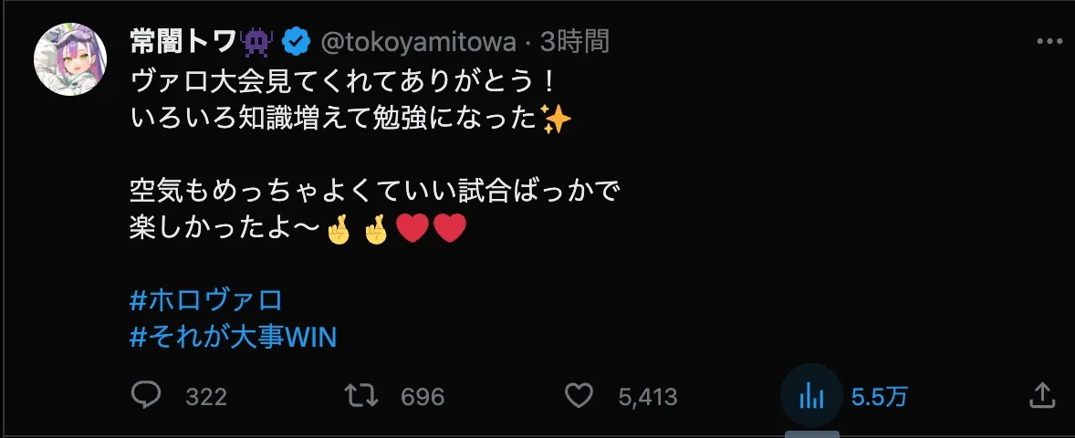 他にも、紫咲シオンが安い武器を使っているのにエース(全員敵を倒すこと)をしたり、常闇トワがプロも使う索敵方法を実践したりレベルの高い場面が多かった。