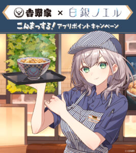 吉野家公式アカウントより、白銀ノエルとのコラボキャンペーンの開始が告知されました。対象店舗で食事をすることで描き下ろしグッズと交換できるポイントキャンペーンです。
