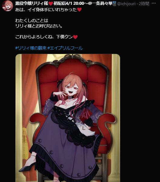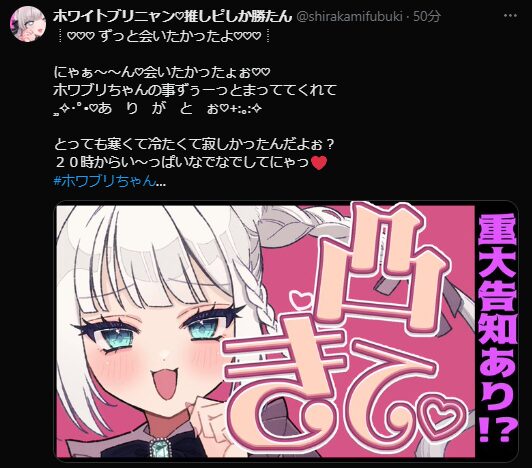 Xでは白上フブキのアカウントを乗っ取っており、4月1日の20時から「ホワイトブリニャン」が凸待ちで配信を行うそうです。