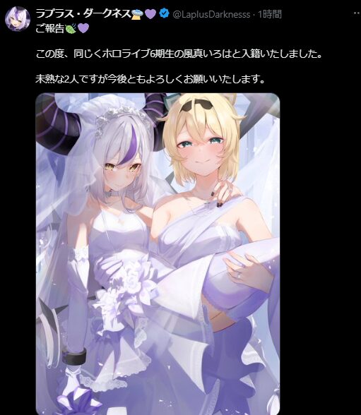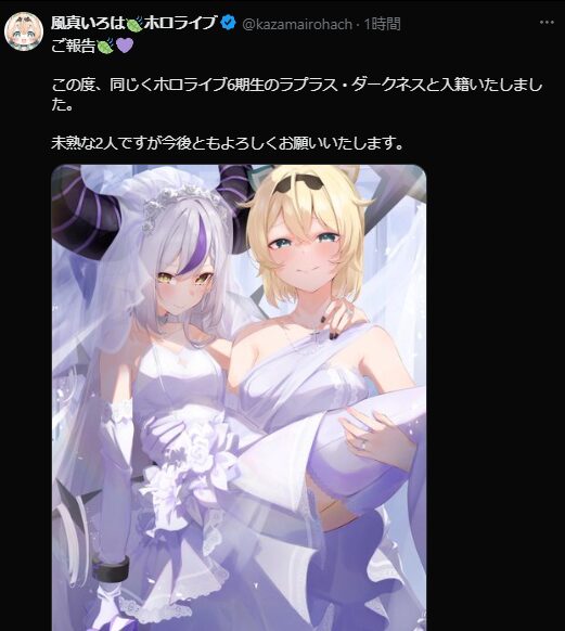 風真いろはとラプラスダークネスが結婚報告を行いました。ラプラスダークネスは同期の博衣こよりを推していたのだが結婚相手は風真いろはということで大きな話題になっていました。