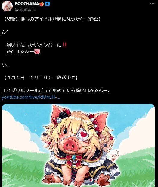 しかしこれはエイプリルフール前から意図せず豚となっていたため、いつ元に戻るのかは全くもって不明です。