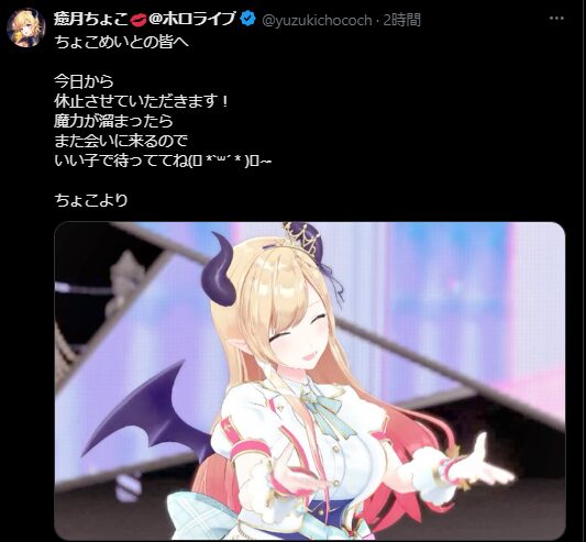 癒月ちょこが休止を発表しました。とてもエイプリルフールのネタとしてはベタなので安心してこの嘘を受け止められます。