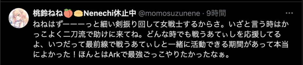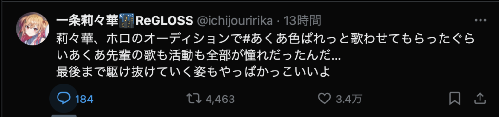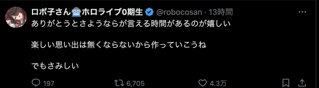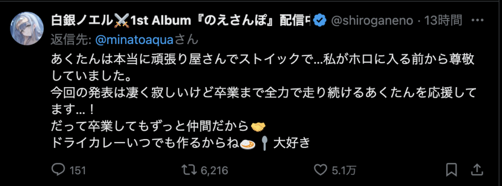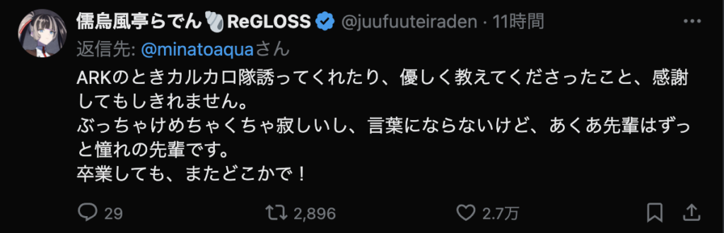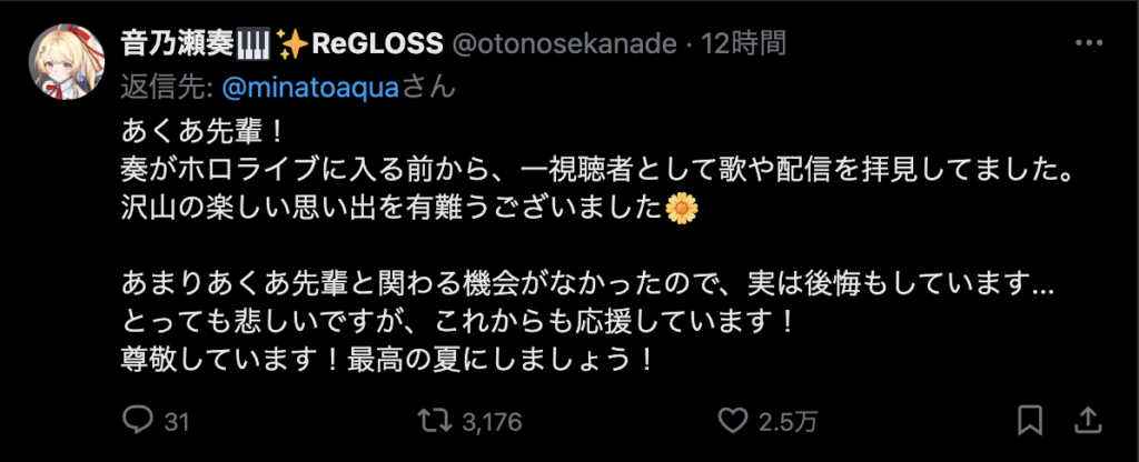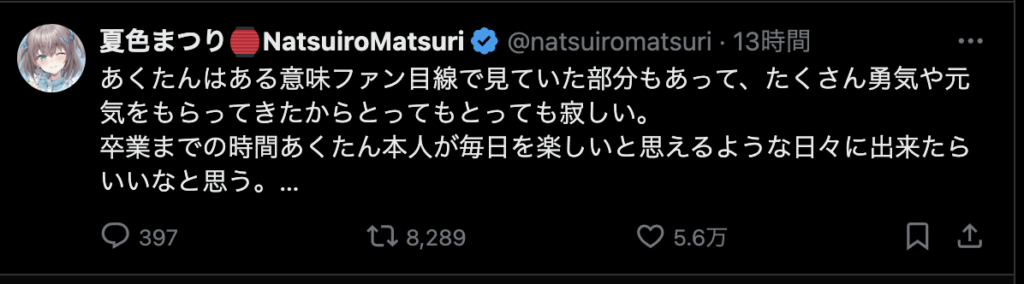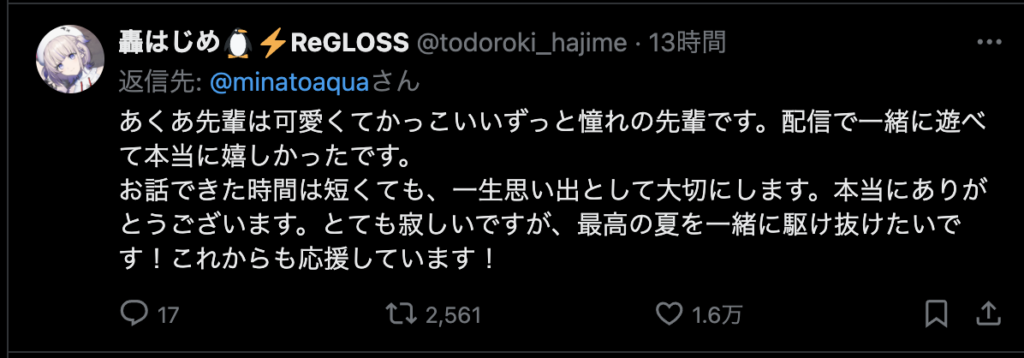 そんな毎日がなくなってしまうのはとても寂しいですが、今までホロライブを盛り上げてくれてありがとうございました。歌も「バカがよぉ!」と煽るところも雑談もとても好きでした。湊あくあさんの未来が輝かしいものであることを願っています。