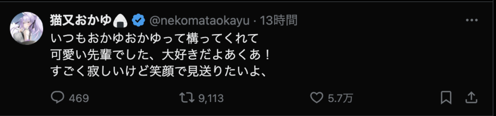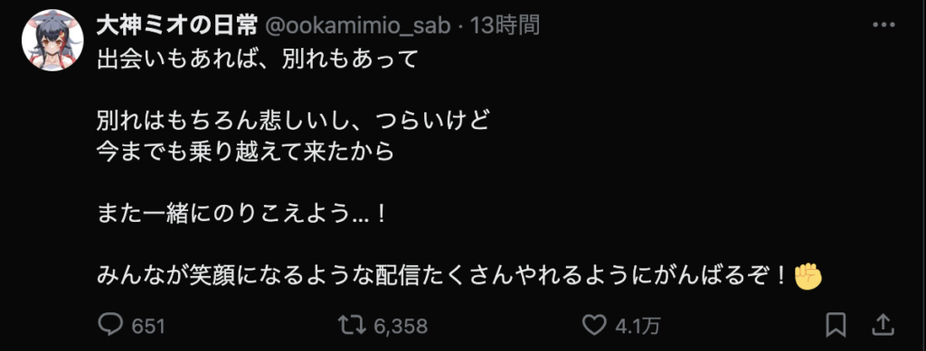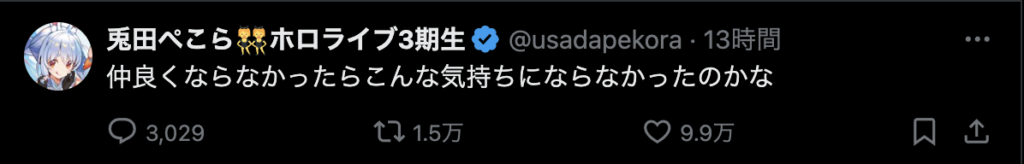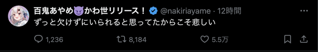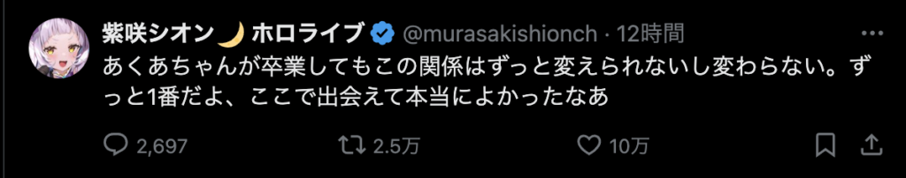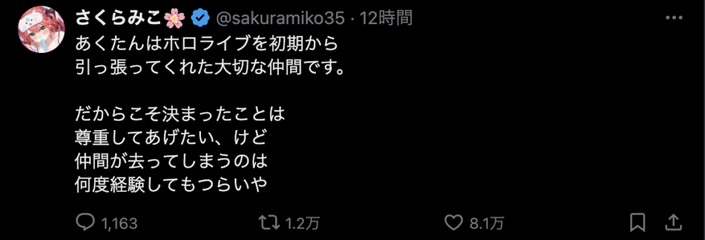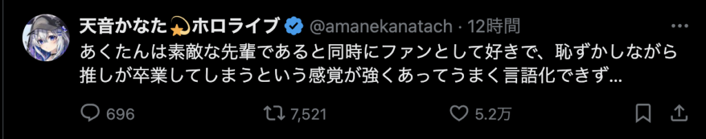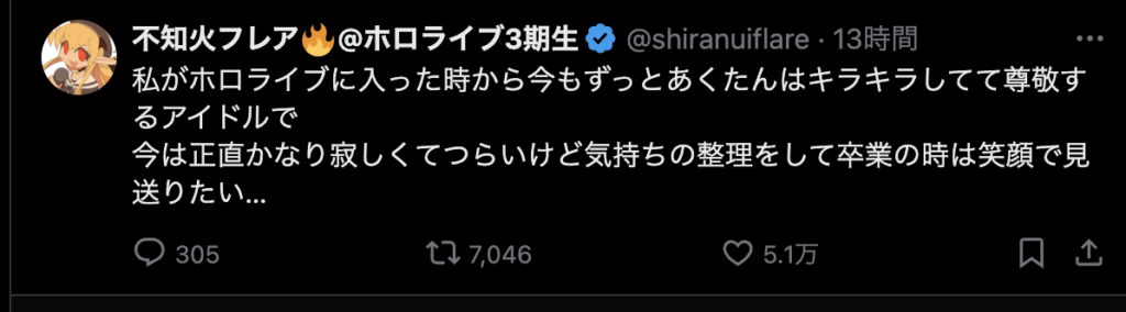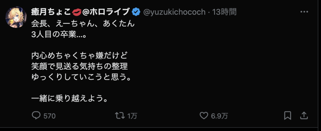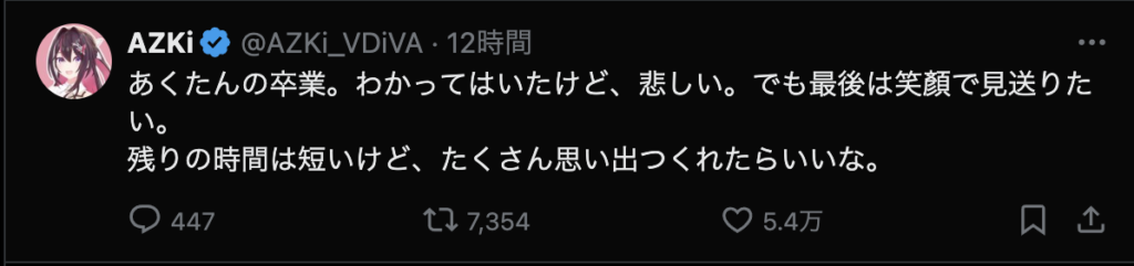 それはそう。いまだに信じられない。でも、これから何年、何十年かの時を経て新たなホロメンが加入し、今まで活動してたホロメンが卒業して色々な出会いと別れを繰り返すことになるのだから、耐性つけておかないと。あくたん、あくたんは沢山の思い出をつくってくれました。ファンとして、すごく悲しいです。こう言うコメントを見て、あぁ、あくたんはほんとうにホロライブから卒業するんだな。ってことを実感させる。でも、信じたくない、信じられない。あくたんが幸せなら、あくたんの信じる道を進めばいいよ。今までありがとう。笑顔で卒業できるといいね!