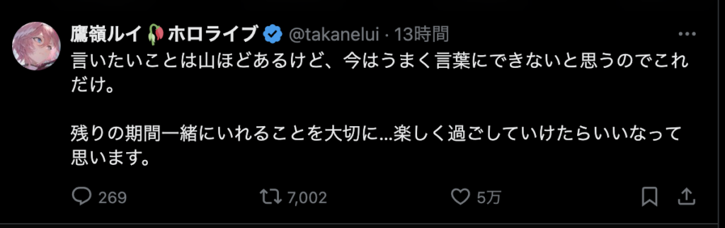 いつのまにか心の支え、生活の一部となっていたことがなくなるのはやっぱ辛い。でも、あくあがそうしたい!っていうなら1ファンとして見送ってあげたいという複雑な気持ち