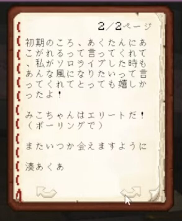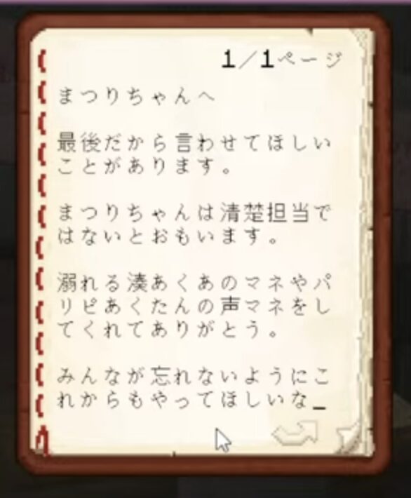 湊あくあのメッセージには、メンバーそれぞれに対する深い愛情とともに、ユーモアが詰まっていた。例えば、紫咲シオンに向けた手紙では、「また、ゲームもお話もしようね」との言葉があり、あくあが卒業しても付き合っていきたいことが伝わる。また、まつりに対しては「清楚担当ではないと思います」という直球のコメントを残し、笑いを誘った。