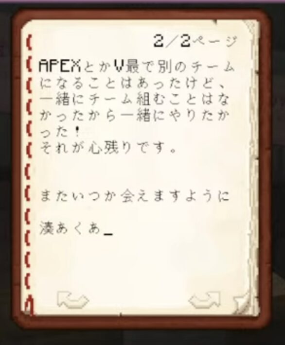 ホロライブ所属のVTuber、湊あくあが自身の配信で、ホロライブ全メンバーに向けた感謝の手紙を公開していた。今回の手紙は、日本語(JP)、英語(EN)、インドネシア語(ID)を含むすべてのホロライブメンバーを対象としており、その分量は非常に多かったため、本記事では一部抜粋での紹介とする。