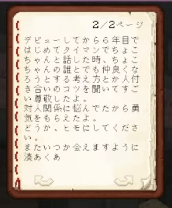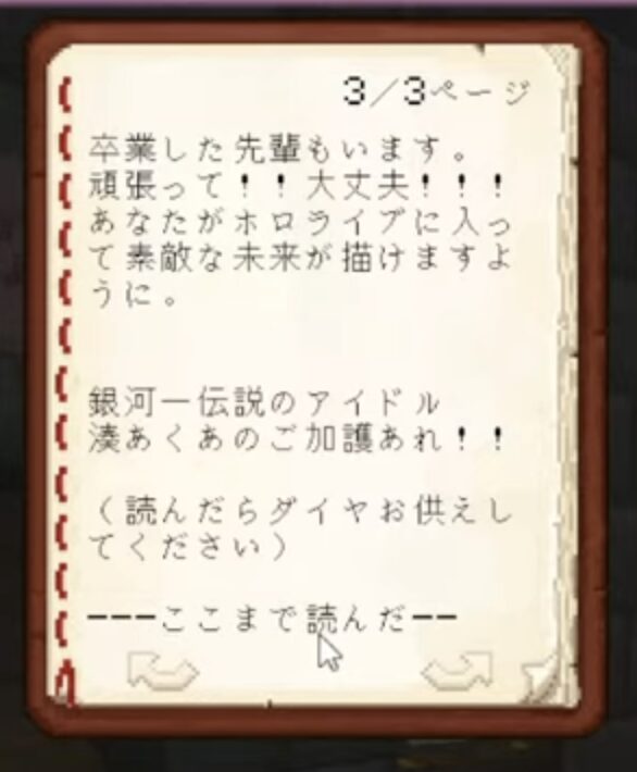 配信の最後には、特別なメッセージとして未来のホロライブメンバーに向けた手紙が読み上げられた。「これからホロライブに加入する人たちへ」という言葉が含まれたこの手紙には、まだ見ぬ後輩たちへの期待と応援が込められていた。湊あくあは、今後ホロライブに加わる新たなメンバーたちが、自分のような先輩を目指し、困難を乗り越えていくことを期待しているのだろう。