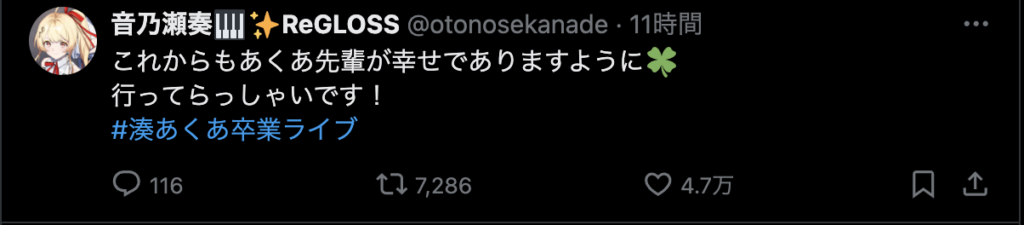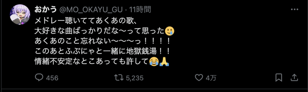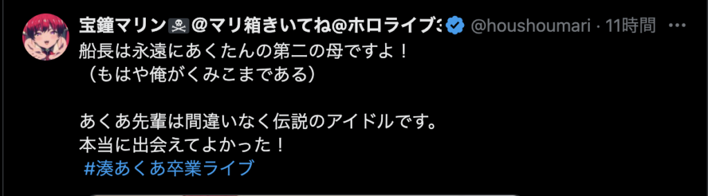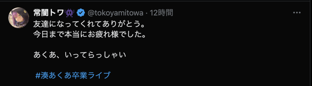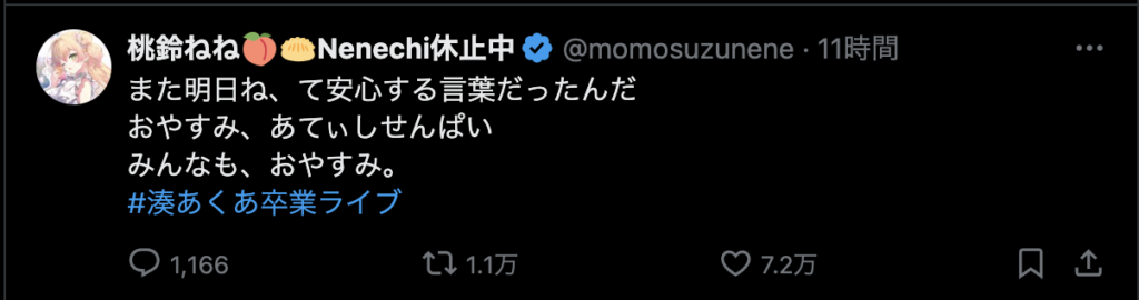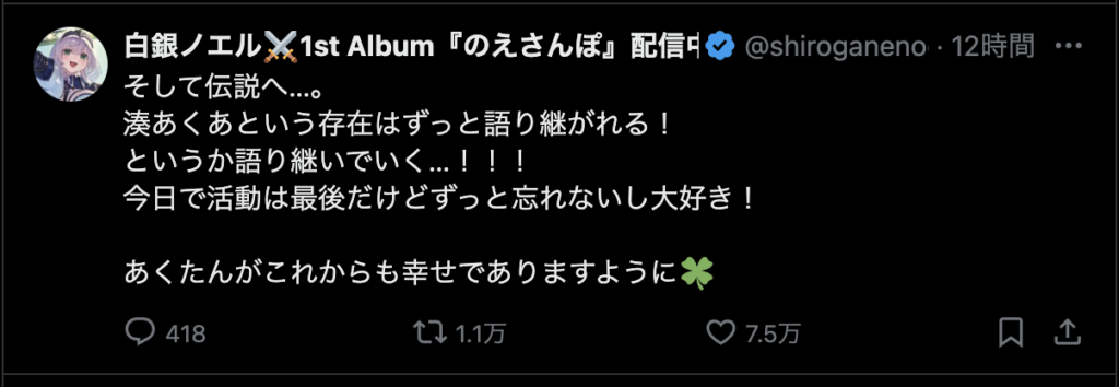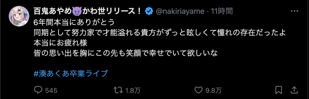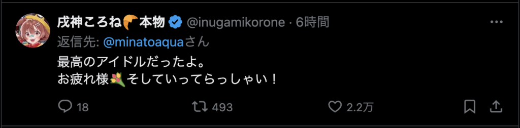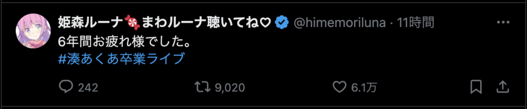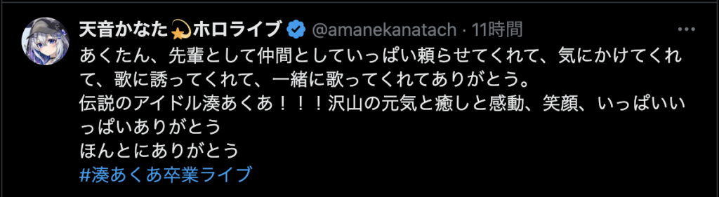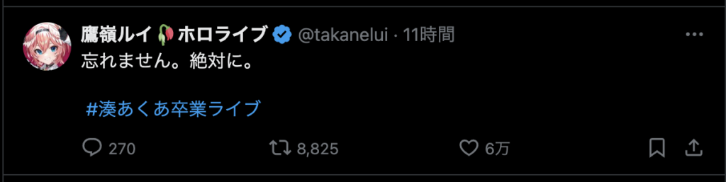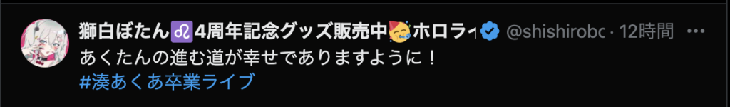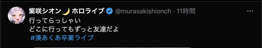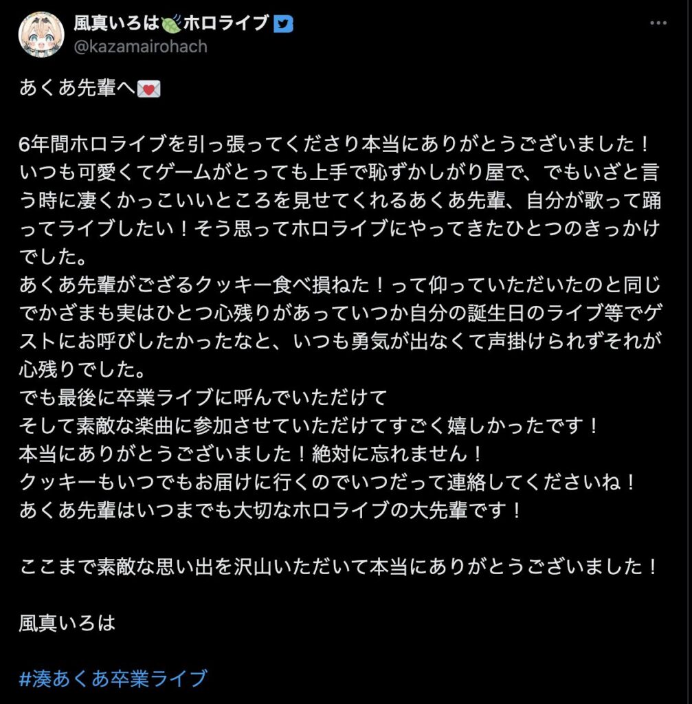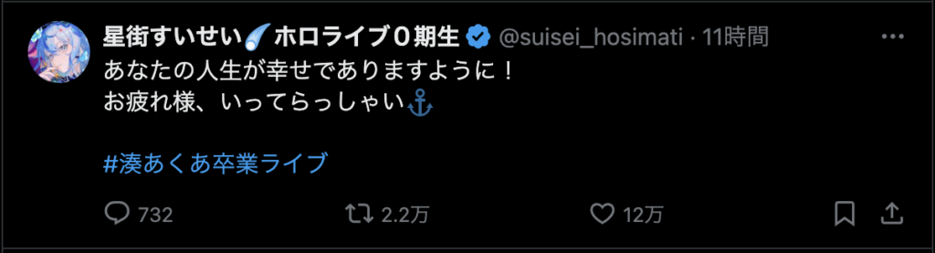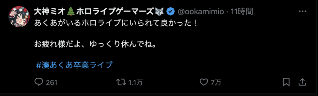 最後に、「ここまで応援してくれたファンのみんな 仲良くしてくれたホロメン、スタッフの皆さん本当にありがとう!」と力強いメッセージを残し、涙と笑顔でステージを後にしました。
