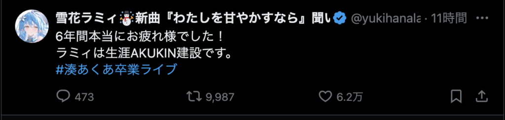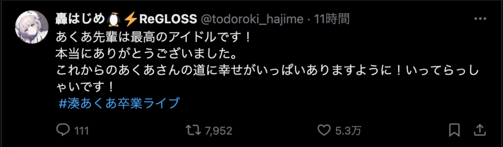 湊あくあの卒業ライブは、ファンにとってもホロメンにとっても、忘れられない一夜となったようです。湊あくあが残した「あくあ色」は、これからもファンの心に色鮮やかに輝き続けることでしょう。