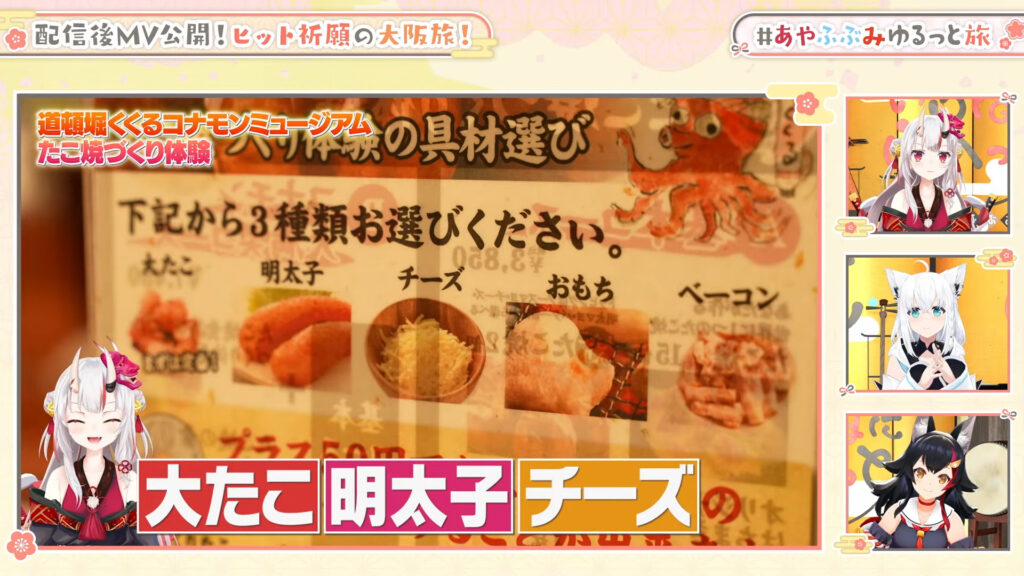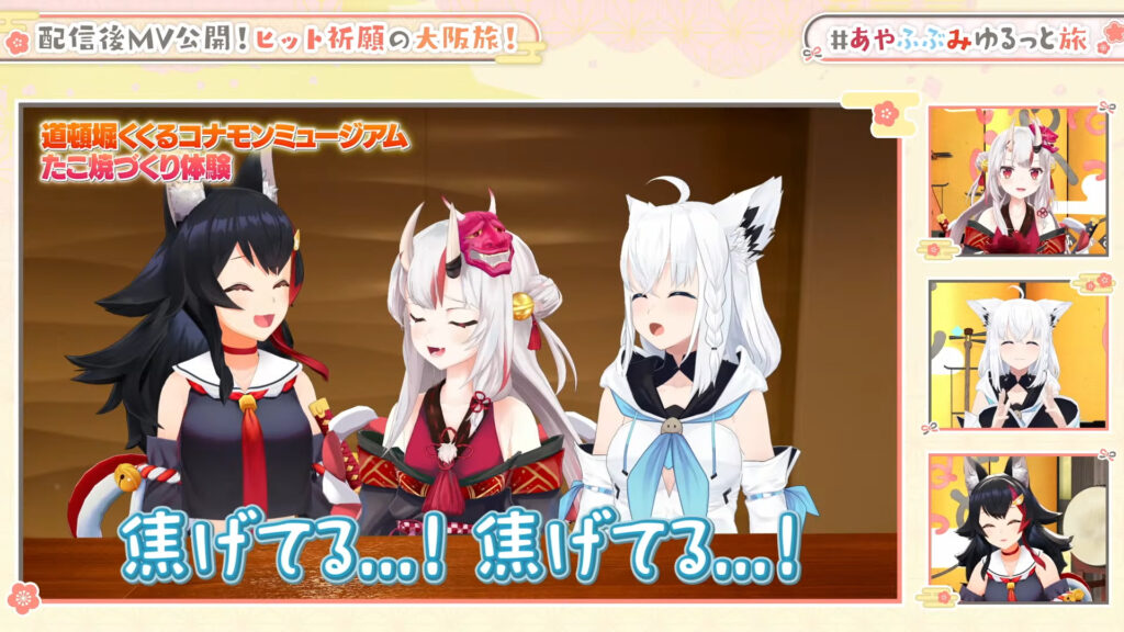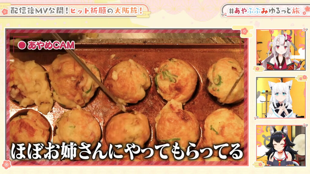 ロケ映像の振り返りでは、白上フブキが後日自宅のたこ焼き器で真似をして失敗したエピソードも明かされ、お店の設備と職人技のすごさを再確認していました。