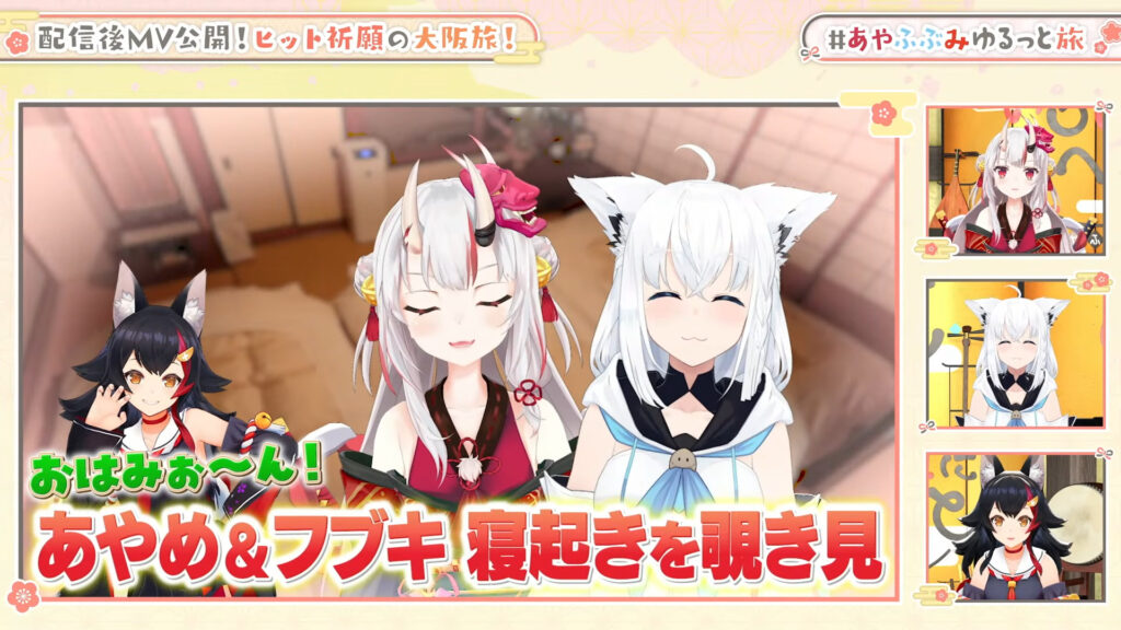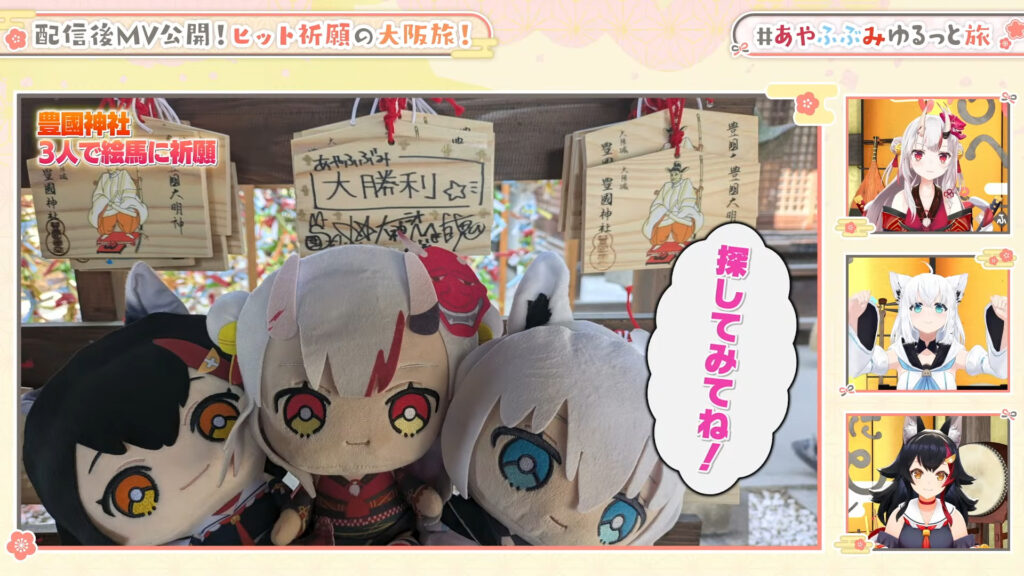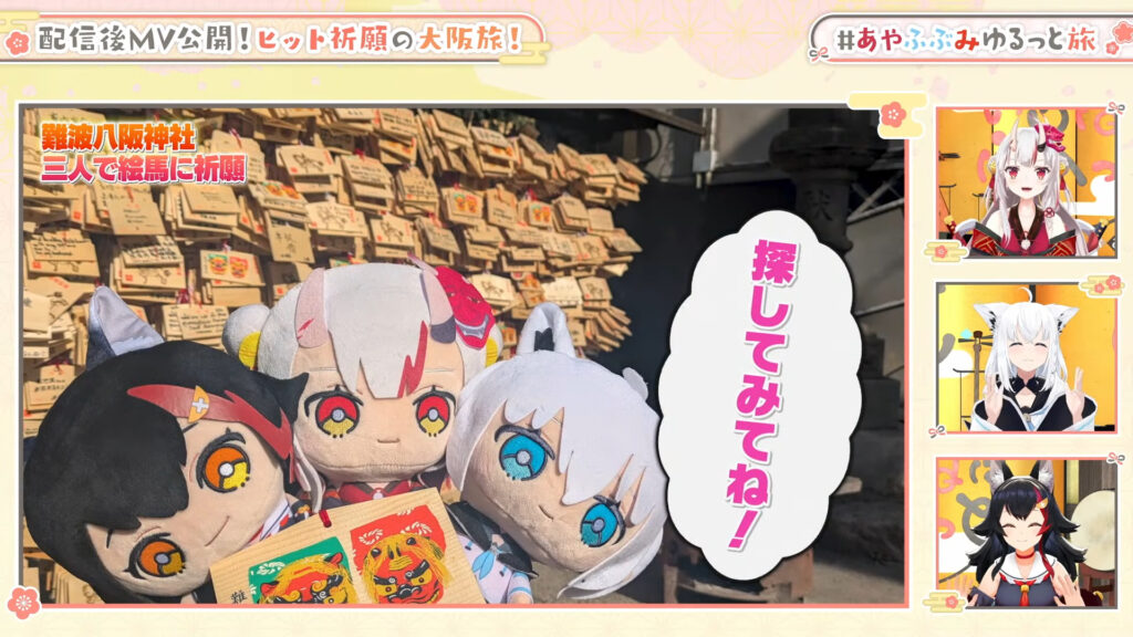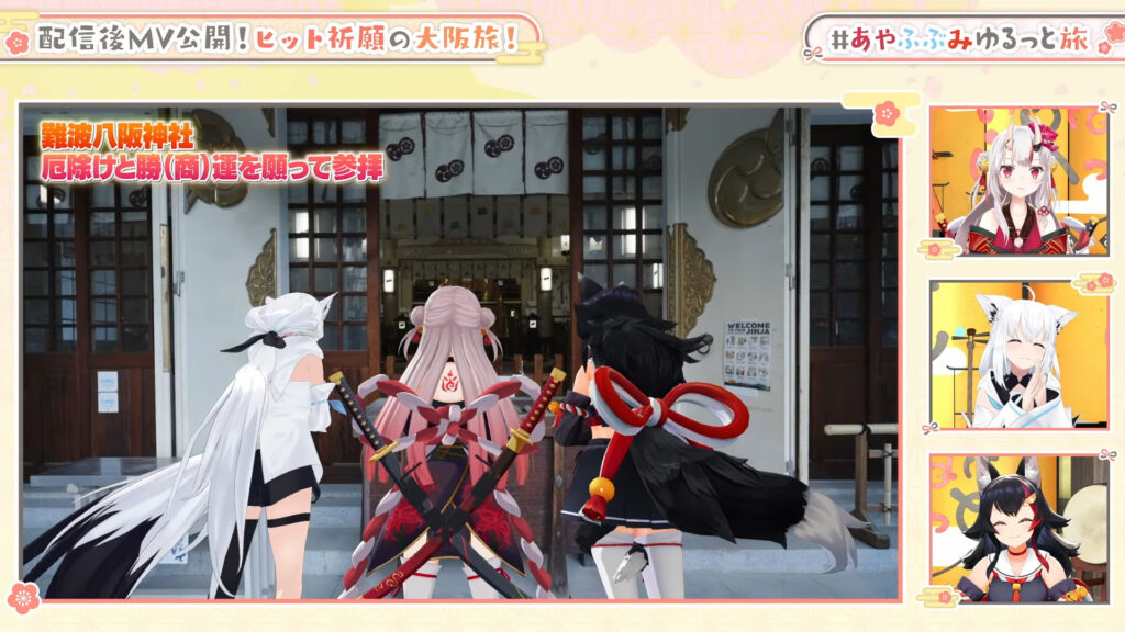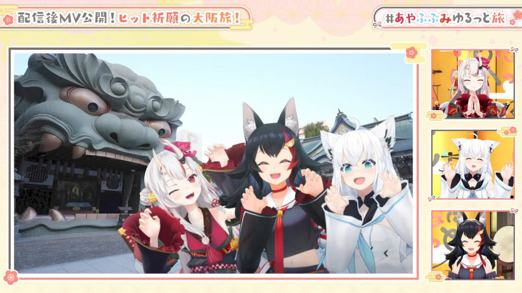 ホロライブ所属の和風ユニット「いろはにほへっと あやふぶみ(白上フブキ、百鬼あやめ、大神ミオ)」が、21日に新曲の大ヒットを祈願して大阪を旅行する様子を公開しました。