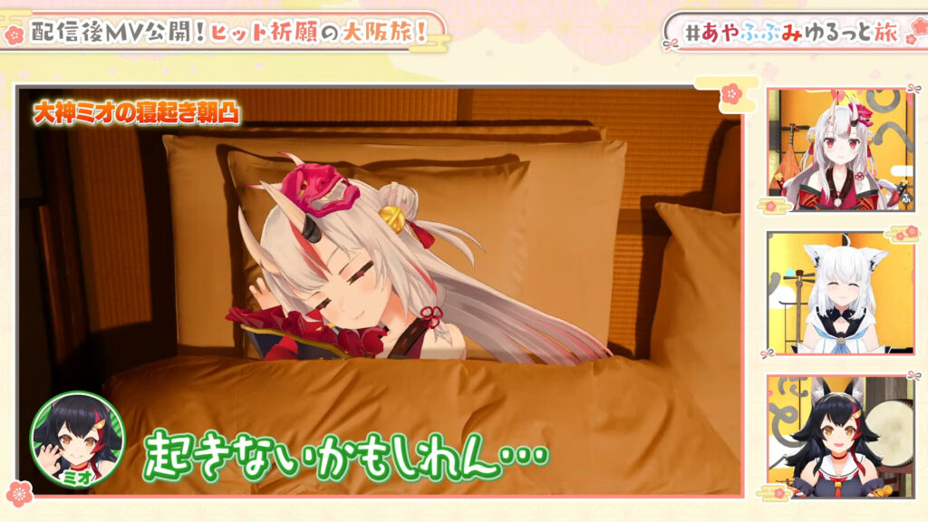 旅の最終日は、朝5時半起きというハードなスケジュールでスタートしました。なかなか起きられない2人を大神ミオが起こす、寝起きドッキリのような一幕から始まります。