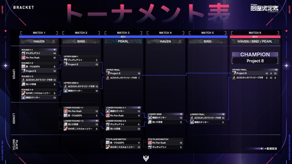 百鬼あやめさん率いるチーム「先いけ忍者」は、叢雲カゲツさん、一ノ瀬うるはさん、小雀ととさん、心白てとさん、そしてGONコーチという布陣で出場。 提供されたトーナメント表(画像参照)によれば、チームはアッパーブラケット第1ラウンドで「ACSたかしのドライブピークを待て」に敗北(8-13)し、ロワーブラケットへ。