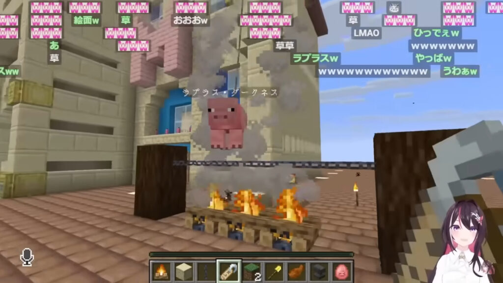 さらに追い打ちをかけるように、AZKiさんは突然「豚の丸焼き」のオブジェを作成。この物語のきっかけとなったラプラス・ダークネスさんの名前を、近くにいた豚につけて丸焼きの近くに配置するなど、現場はどんどん予測不能なカオスな状況へと陥っていきました。