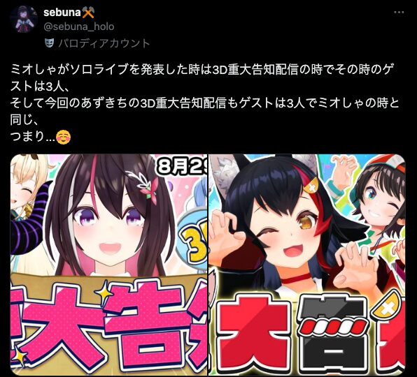 すると、あるファンから「ミオしゃがソロライブを発表した時は3D重大告知配信の時でその時のゲストは3人、そして今回のあずきちの3D重大告知配信もゲストは3人でミオしゃの時と同じ、つまり..」という考察が投稿され、瞬く間に拡散。