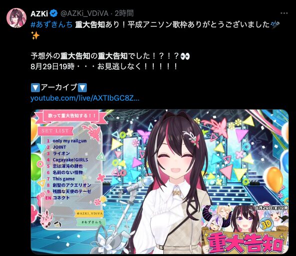 この発表を受け、AZKiさん自身も配信後にX(旧Twitter)を更新。「予想外の重大告知の重大告知でした!?!? 8月29日19時・・・お見逃しなく!!!!! 」とポストしました。