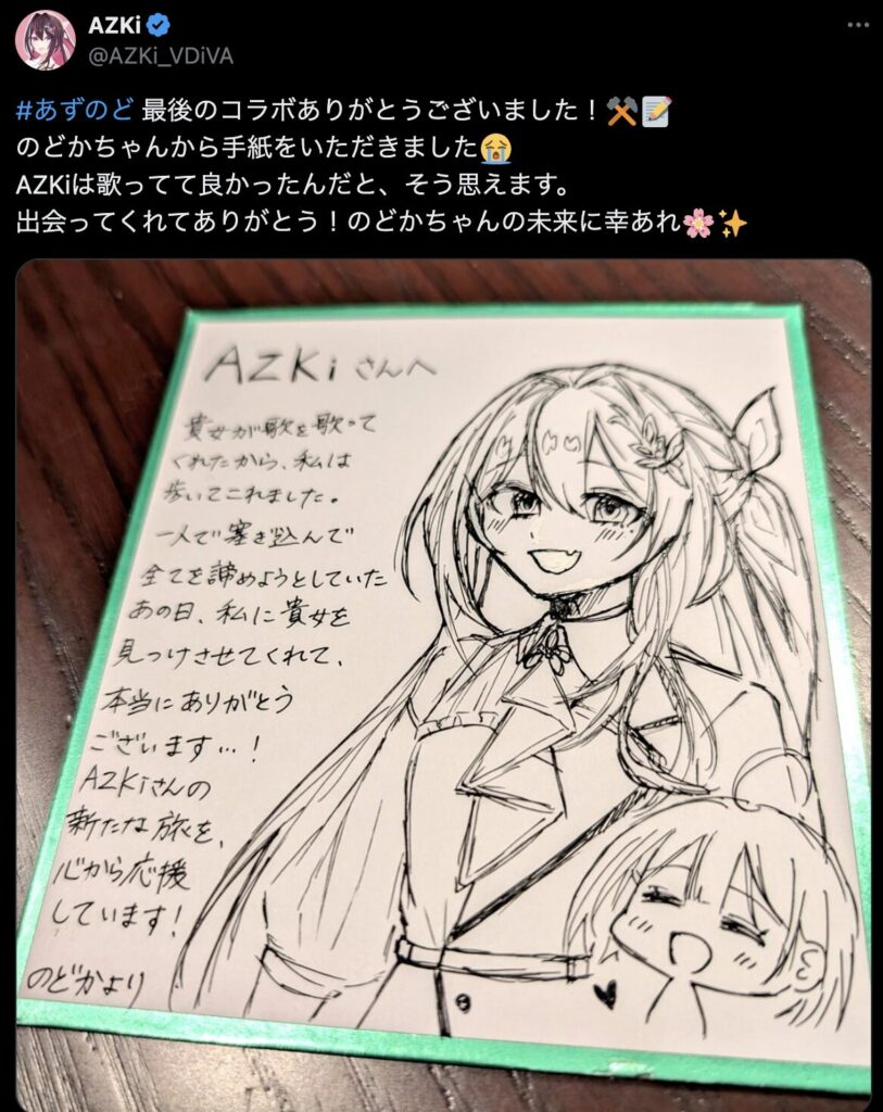 配信の終盤、のどかさんが「ちょっとAZKiさんに渡したいものがあって…」と切り出したことで、空気はしんみりします。