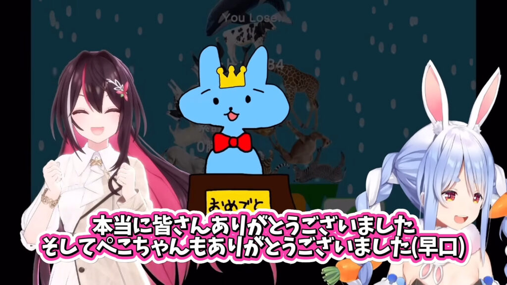 ぺこらさんが「あれ? 早口、早口すぎませんか?」とツッコミを入れると、AZKiさんは「そんなことないですよ!」と否定しつつも、贈呈される優勝品(ぺこらさん手書きのトロフィー画像)にも「ありがとうございます!」と間髪入れずに即答。ぺこらさんが「感想とかね、全然言っていただいて大丈夫ですよ」と促すも、AZKiさんは