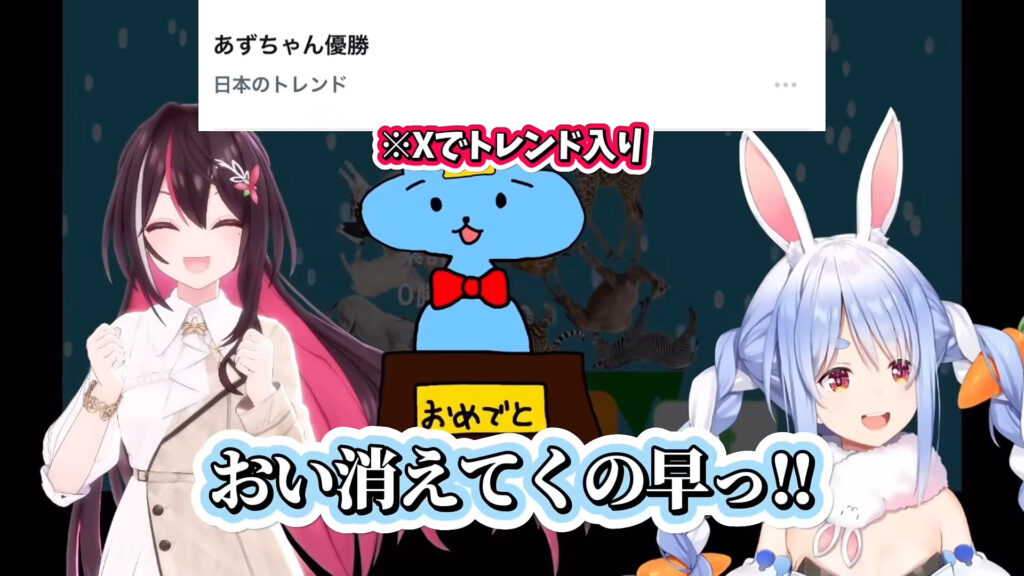 大会は白熱したバトルが続き、決勝戦が終わったのは21時55分。なんとAZKiさんは22時から自身の枠での配信(GeoGuessr)を予定していました。ぺこらさんが「10時から枠がある。あずちゃんが優勝です!」と祝福すると、AZKiさんは「ありがとうございます! なんとか間に合いそうです皆さん!」と、明らかに焦りが感じられる早口で応答。