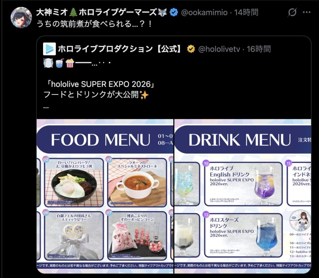 ホロライブの大型リアルイベント「hololive SUPER EXPO 2026」(2026年3月6〜8日開催)で提供されるコラボフードメニューが、ファンの間で大きな話題を呼んでいます。
