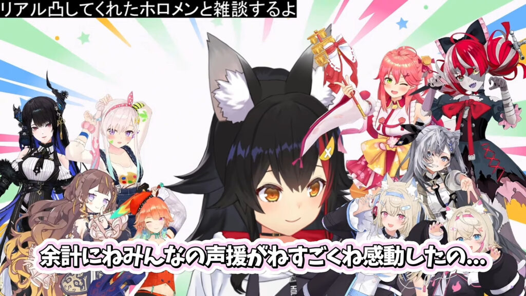 EN・IDメンバーをはじめ、さくらみこも駆けつけ、フェス直後の興奮冷めやらぬなか、メンバーたちが一人ずつ感想を語り合う温かいひとときとなりました。