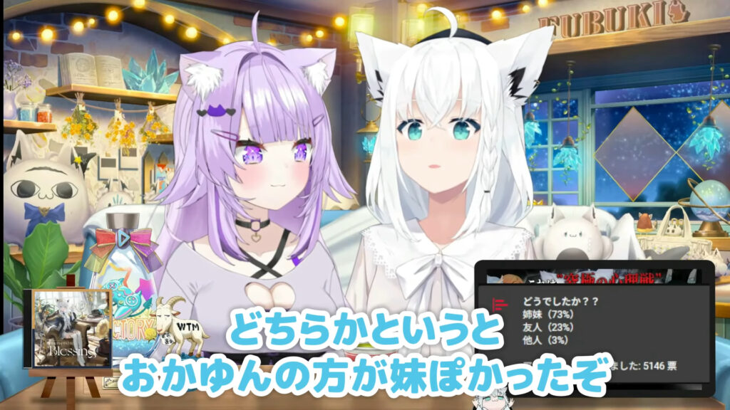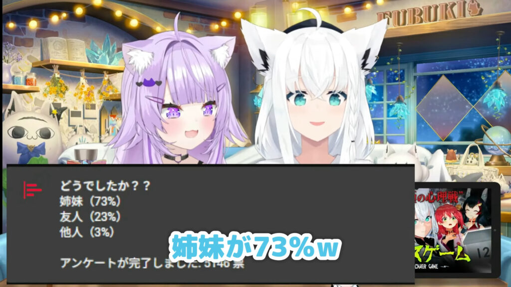 最初のアンケート結果を受け、「じゃあ、さっきのゲームで妹っぽかったのはどっち?」という新たなアンケートが始まりました。白上フブキさんは、ゲーム中の猫又おかゆさんの言動が妹っぽかったと主張します。