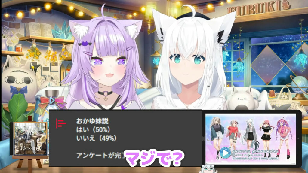 ことの発端は、白上フブキさんと猫又おかゆさんが行ったゲーム配信後の雑談でした。二人の関係性について、視聴者にアンケートを取ってみようという流れになったのです。