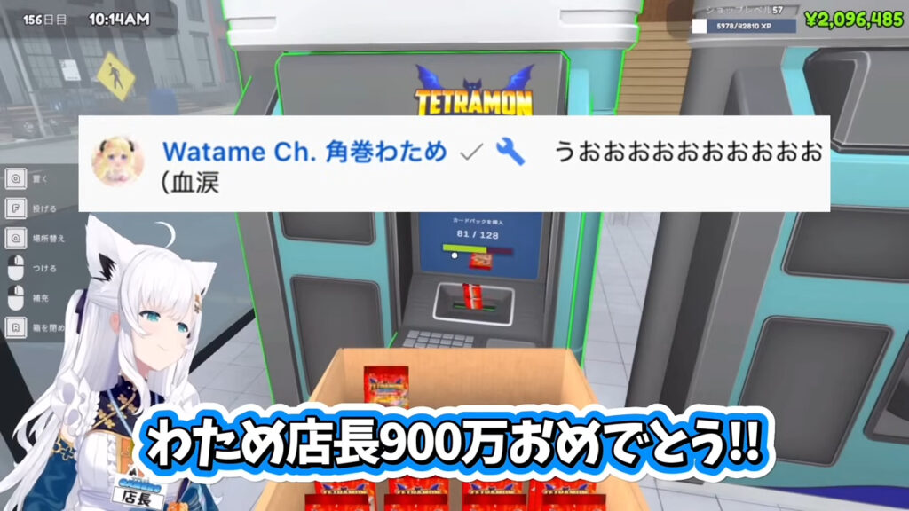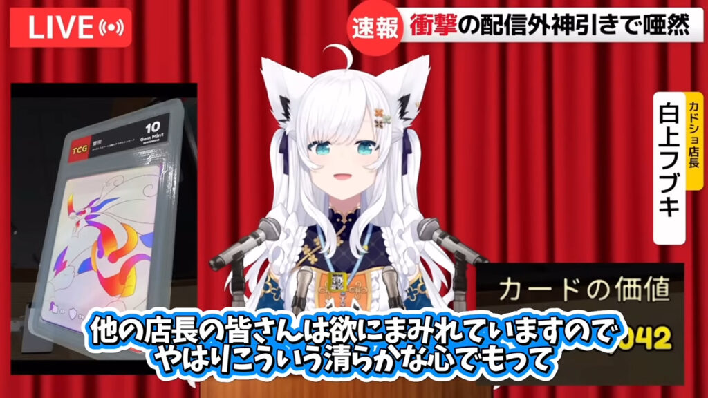 ホロライブ1期生兼ホロライブゲーマーズの白上フブキさんが、自身の配信でゲーム『TCG Card Shop Simulator』内で1000万円を超える超高額カードを「配信外」で引き当てたことを報告。