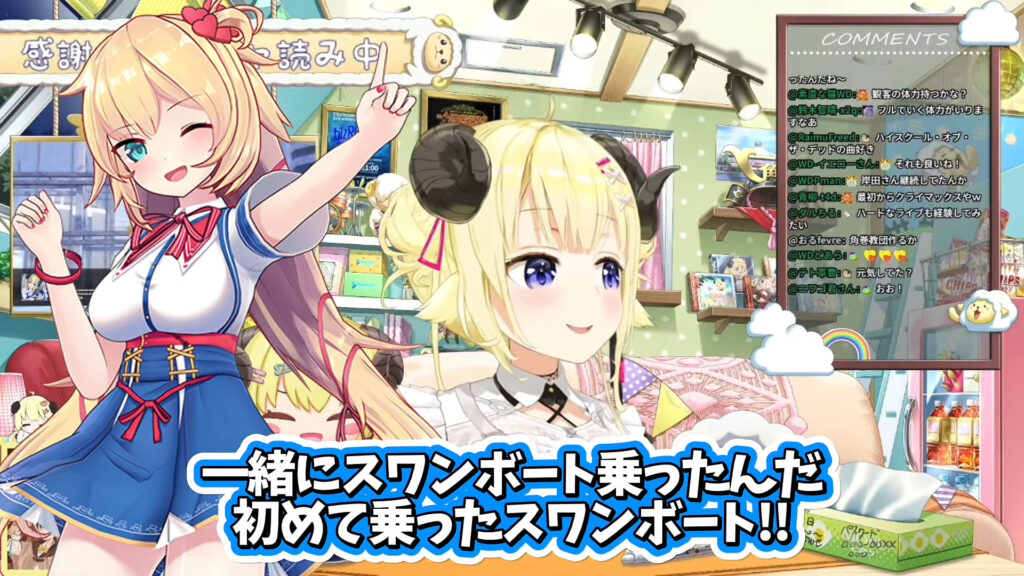 わためは配信中、「こないだはあちゃまとも遊んできて、一緒にスワンボートに乗ったんだ。初めて乗ったスワンボート」と打ち明けました。はあちゃまの様子については「めっちゃ元気そうだった」と述べ、ファンを安心させました。