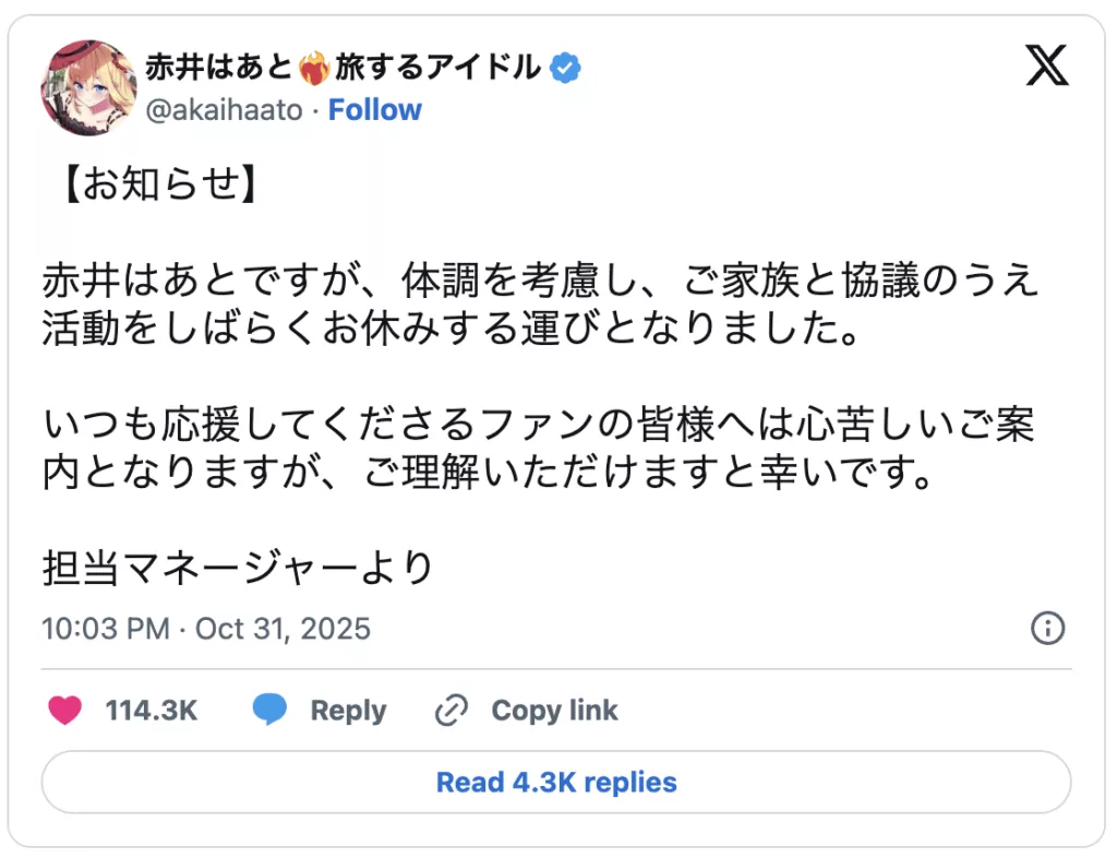 赤井はあとは2025年10月31日、担当マネージャーより「体調を考慮し、ご家族と協議のうえ活動をしばらくお休みする運びとなりました」とXで発表しました。