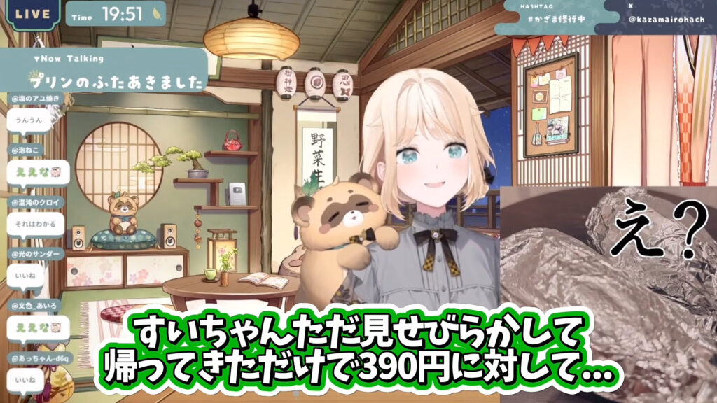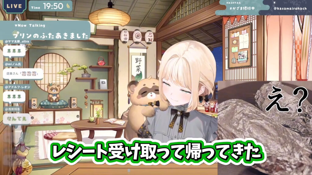 風真さんは「えっ」と思って気づき、慌てて「あ、これすいちゃんじゃん」と理解したものの、店員さんは笑顔で対応してくれたといいます。レシートを受け取って帰ってきた風真さんでしたが、配信では恥ずかしさを隠せない様子でした。