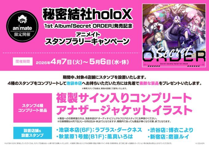 ホロライブ6期生ユニット「秘密結社holoX」のアニメイトスタンプラリーが2026年4月に開催中です。東京都内のアニメイト4店舗を巡ってスタンプを集めると、景品として複製サイン入りアナザージャケットがもらえます。