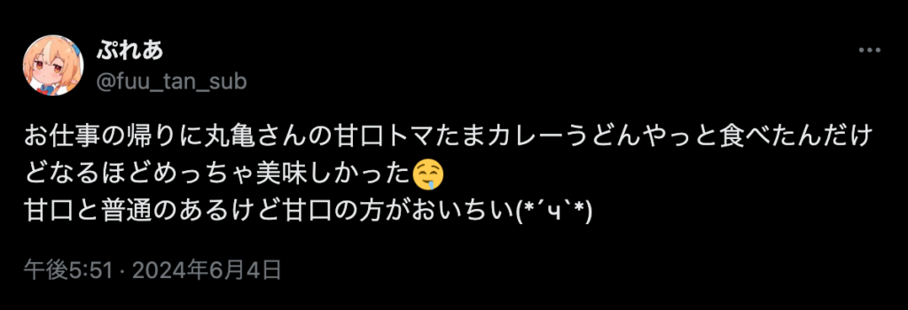 ホロライブのVTuber、不知火フレアさんが自身のX(旧Twitter)で、仕事帰りに丸亀製麺の甘口トマたまカレーうどんを食べて美味しかったことを報告しました。フレアさんはこのメニューについて「めっちゃ美味しかった」と絶賛し、甘口の方がお気に入りだとコメントしています。