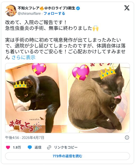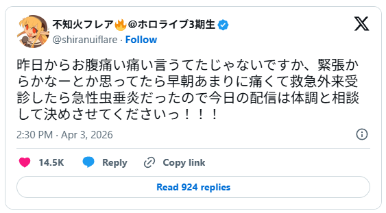 4月3日、ホロライブ3期生の不知火フレアさんが急性虫垂炎により緊急手術を受けたことが、本人のXポストで明らかになりました。