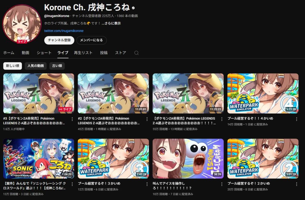 人気VTuber事務所「ホロライブプロダクション」所属の「ホロライブゲーマーズ」メンバー、戌神ころねさんが、10月15日深夜から翌日にかけ、自身のYouTubeチャンネル「Korone Ch. 戌神ころね。」にて新作ゲーム『Pokémon LEGENDS Z-A』の発売記念配信を実施。