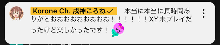 配信を終えた戌神さんは、自身のSNSで「本当に本当に長時間ありおおおおおおおおお!!!!!XY未プレイだったけど楽しかったです!」(画像参照)と、疲れを微塵も感じさせないハイテンションな感謝と達成感をコメントしました。
