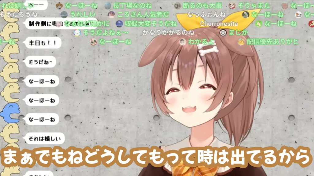 ころねさんは自身の収録スタイルについて、非常に時間がかかるタイプだと説明します。