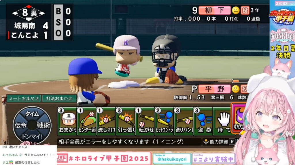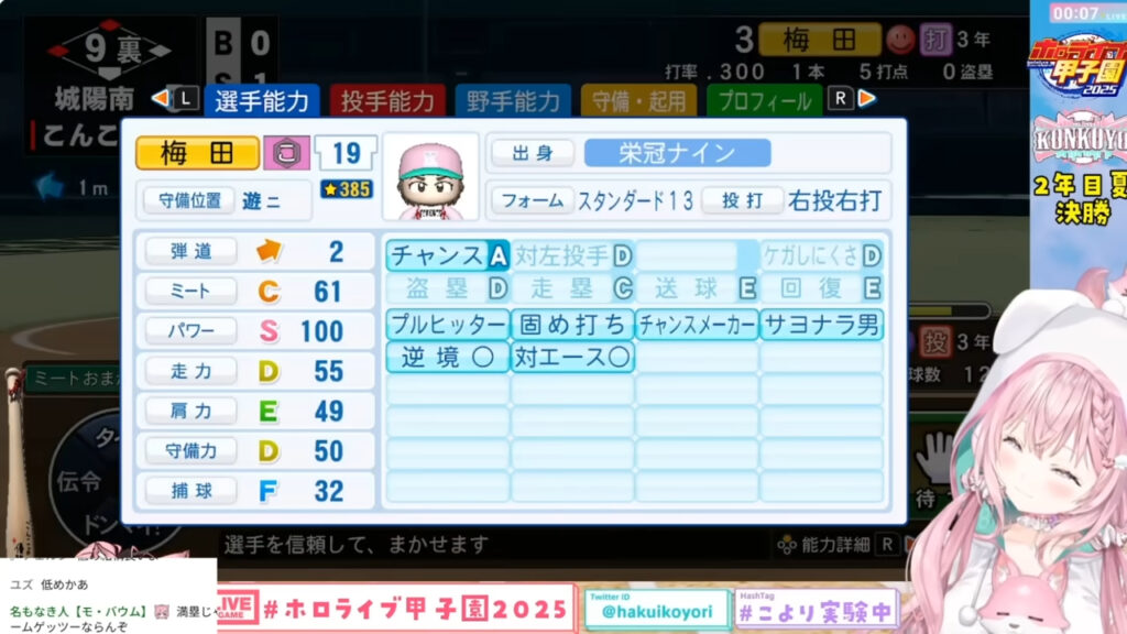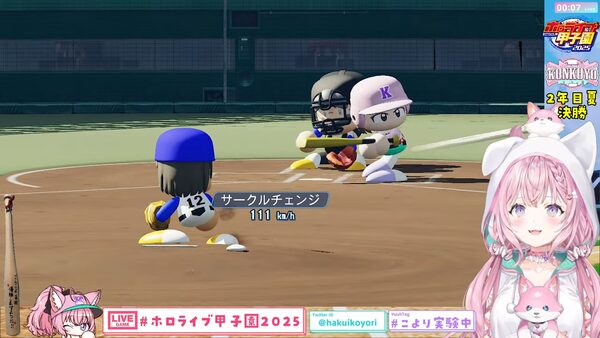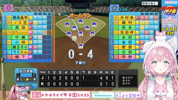 大型企画「ホロライブ甲子園2025」に向け、人気野球ゲーム「パワフルプロ野球」の「栄冠ナイン」モードで選手を育成中の博衣こよりさん。