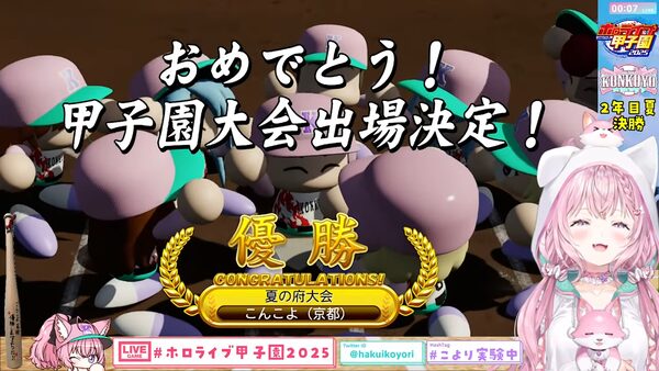 2025年9月23日に博衣こよりさんが配信された「ホロライブ甲子園2025」にて、「こんこよ高校」が、府大会決勝で劇的なサヨナラ勝利を収め、見事甲子園出場を決めました。