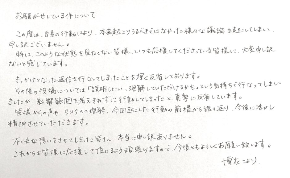こよりさんは「きっかけとなった返信を行なってしまったことを深く反省しております」と発端に言及。現在、この「きっかけとなった返信」と見られるポストは削除されています。その後の投稿についても「『説明したい、理解していただけるかも』という気持ちで行ってしまいました」と当時の心境を明かし、「影響範囲を考えずに行動してしまったと、真摯に反省しています」と自身の行動を振り返りました。