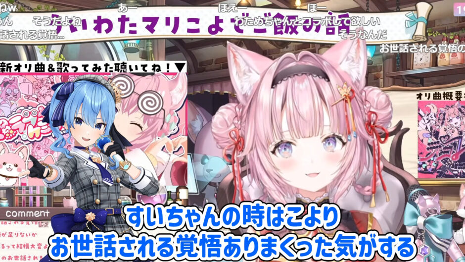 こよりさんはすいせいさんより先輩にあたりますが、「先輩なのに焼いてもらっちゃう」「ありがとうございますって言いながら肉を食べさせてもらった」と苦笑い。