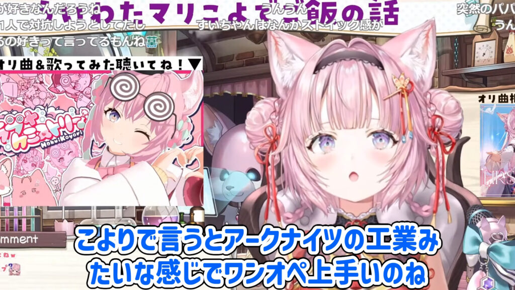 その手際の良さについて、「1個1個の作業みたいな感じで向き合っているんだと思う。こよりで言うとアークナイツの工場自動化みたいな感じ」と独自の分析で視聴者を笑わせました。