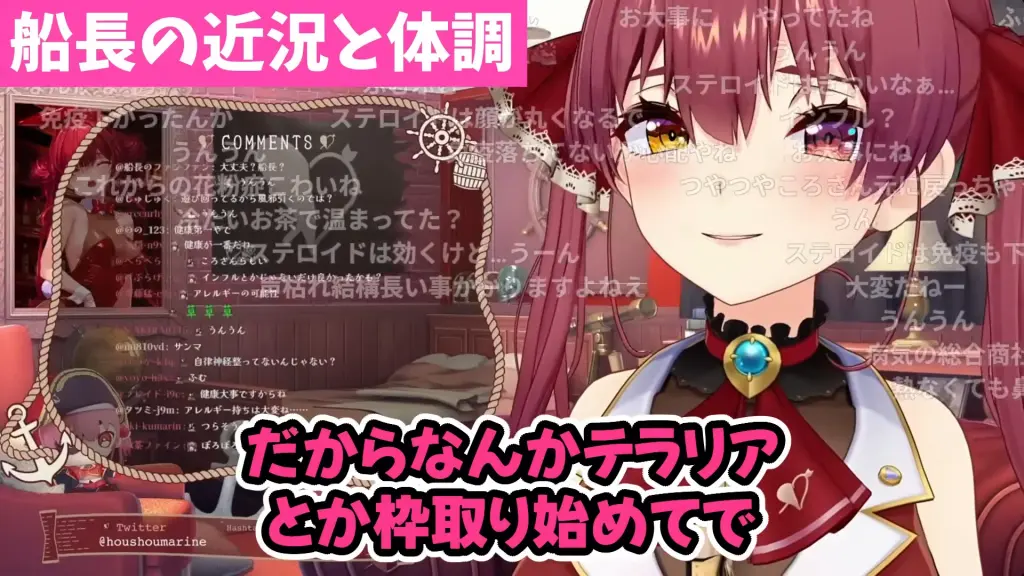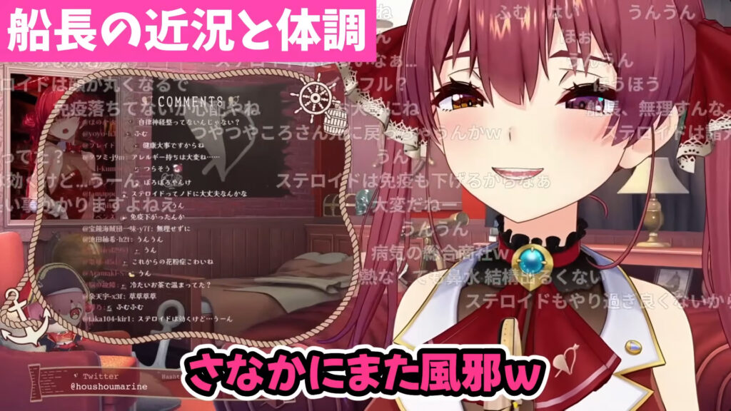 配信では、リスナーから「ステロイドは免疫を下げるから風邪を引きやすくなるよ」と指摘される場面も。マリンさんは「え、飲み薬じゃなくて吸入薬も同じなの? マリンの中では喉の塗り薬みたいなニュアンスで捉えてたんだけど……」と驚いた様子を見せていました。