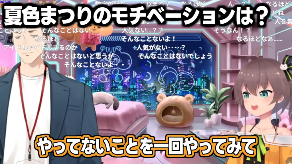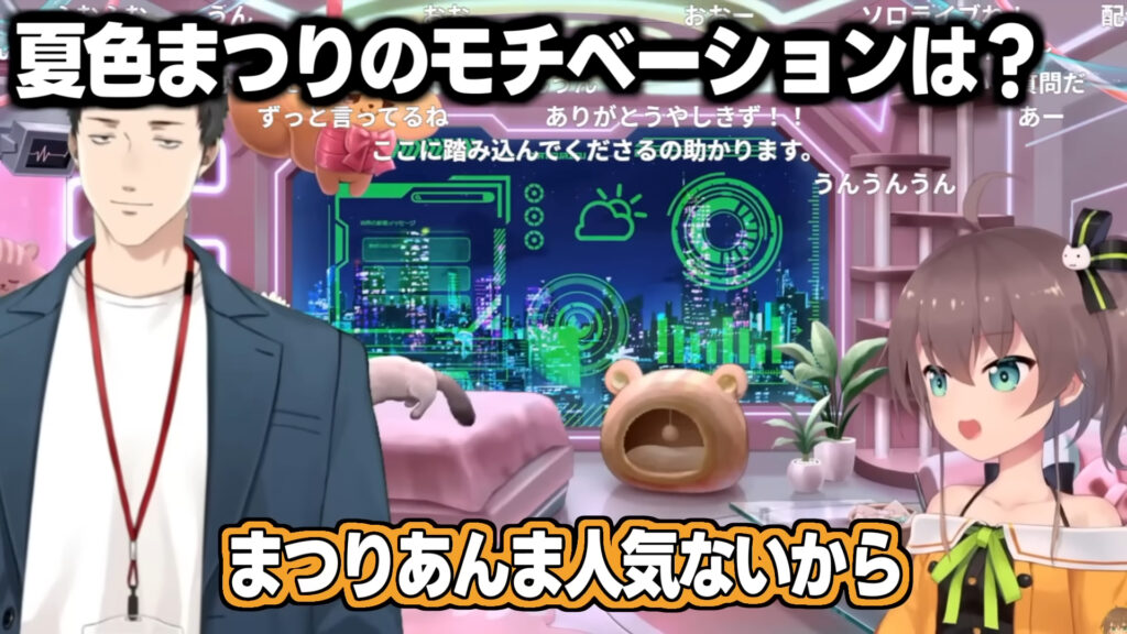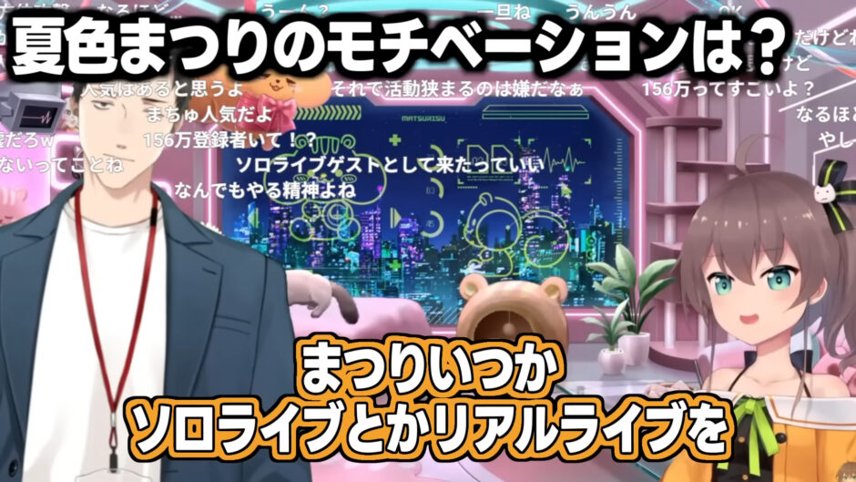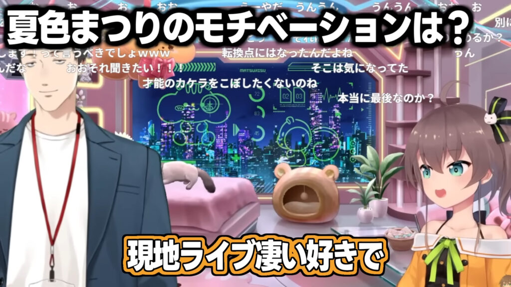 配信の中で、「今の活動のモチベーションは何か」という問いに対し、夏色まつりは「ライブが好き」と答えました。
